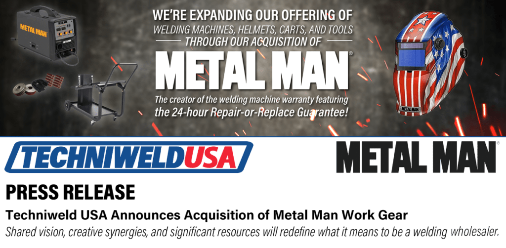 Techniweld USA has acquired Wisconsin-based Metal Man Work Gear, the nation’s primary private labeler of welding machines, vivid welding helmets, welding carts, and cabinets for distributors. Metal Man is known as the leader of the “24-hour Repair or Replace Welder Warranty,” providing distributors a truly “sell-and-forget” platform of ultra-high quality welding machines. The combination of each organization’s strengths and resources means that Techniweld USA will now offer our customers solutions for all their welding needs!